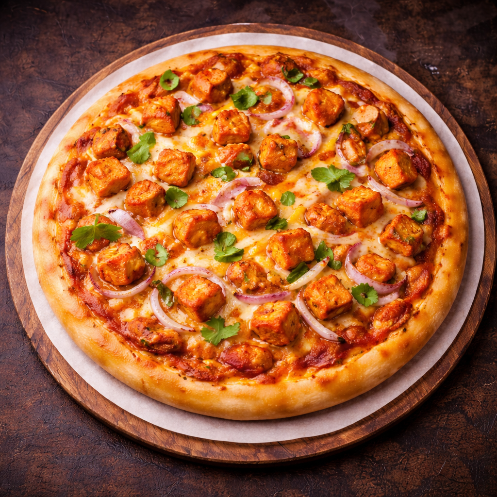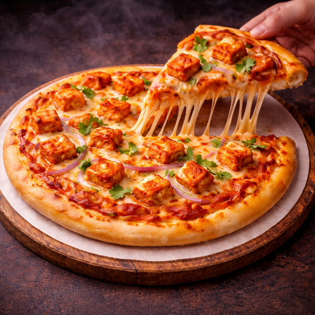 A deliciously simple and fully loaded pizza made especially for paneer lovers. This pizza is topped with soft, juicy paneer cubes spread generously over a rich and tangy tomato pizza sauce, and finished with a thick, stretchy layer of melted cheese. No onion, no capsicum, no extra veggies — just pure paneer and cheese in every bite. Perfectly baked for a crispy base, cheesy top, and a satisfying desi flavour that feels rich and filling. Best enjoyed hot for the ultimate cheesy paneer experience.