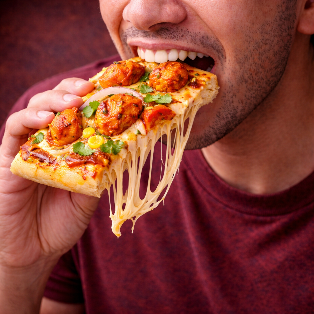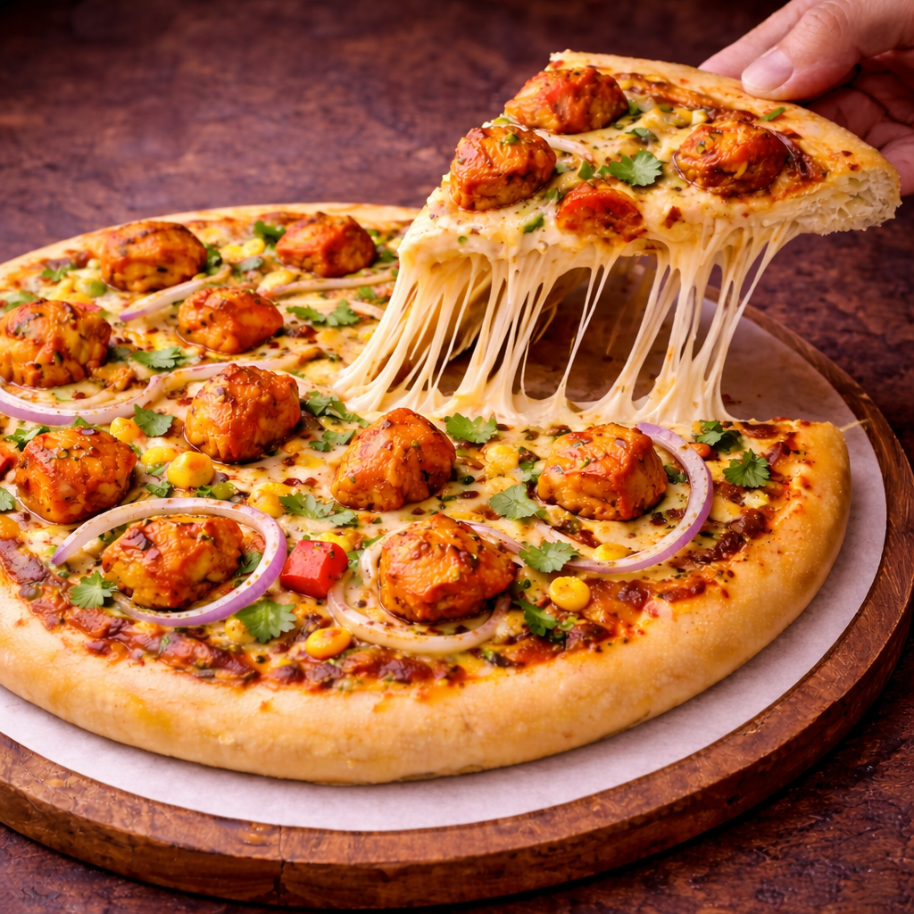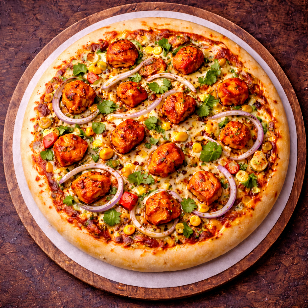 A bold and delicious pizza topped with juicy tandoori chicken pieces marinated in smoky Indian spices, layered over rich tomato pizza sauce and finished with a generous amount of melted cheese. Every slice gives the perfect mix of spicy tandoori flavour, cheesy goodness, and a satisfying chicken bite. Perfectly baked for a crispy base and cheesy top — best enjoyed hot with oregano and chilli flakes.